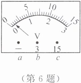 6. 小明用有“$ 0 \sim 3 $ 伏”和“$ 0 \sim 15 $ 伏”两个量程的电压表测电压时,电压表“$ - $”接线柱已接入电路,用“$ 0 \sim 15 $ 伏”量程试触时,指针位置如图所示,则下一步实验操作应是(