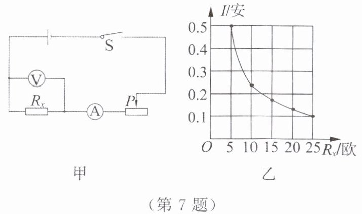 7. 某同学利用如图甲所示的电路图进行实验,电源电压恒为 $ 3 $ 伏,更换 $ 5 $ 个定值电阻 $ R_x $,得到如图乙所示的图像。下列叙述中,正确的是(