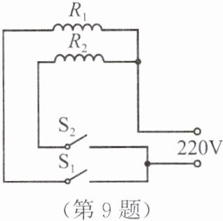 9. 如图所示为多挡位加热器的电路图,电热丝 $ R_1 $ 的电阻小于电热丝 $ R_2 $ 的电阻。闭合 $ S_1 $ 和 $ S_2 $ 时,下列对电路的分析,正确的是(