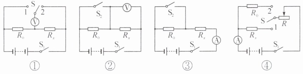11. 如图所示为小科利用实验室常用仪器来测量未知电阻 $ R_x $ 的阻值的四种电路,电源电压恒定且未知,$ R_0 $ 是已知阻值的定值电阻,滑动变阻器 $ R $ 的最大阻值未知,实验中只能闭合或断开开关及移动滑动变阻器的滑片,其中能够测量出 $ R_x $ 的阻值的电路(