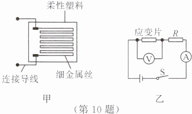 10. 将一根细金属丝置于柔性塑料中,可以制成用来检测物体形变的元件——应变片,其结构如图甲所示。将它接入如图乙所示的电路,电源电压不变,$ R $ 为定值电阻。闭合开关 $ S $,当应变片随被检测物体发生拉伸形变时,柔性塑料中的金属丝会被拉长并且变细,导致电阻变大,此时电路中的(