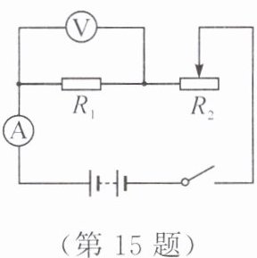 15. 按如图所示的电路研究电流与电压的关系。已知电源电压为 $ 6 $ 伏,$ R_1 $ 为定值电阻,滑动变阻器 $ R_2 $,标有“$ 20 \Omega \quad 1 A $”的字样,电流表的量程为“$ 0 \sim 0.6 A $”,电压表的量程为“$ 0 \sim 15 V $”。