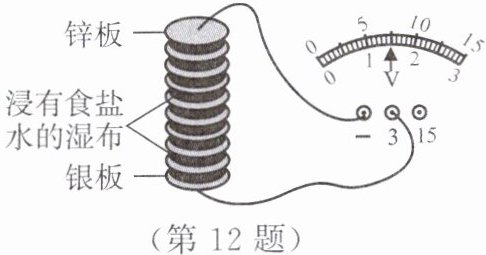 12. 意大利人伏打于 $ 1791 $ 年发明了最早的电池——伏打电堆。小嘉仿造了一个伏打电堆,并用电压表测量其电压,如图所示。此电堆的正极是