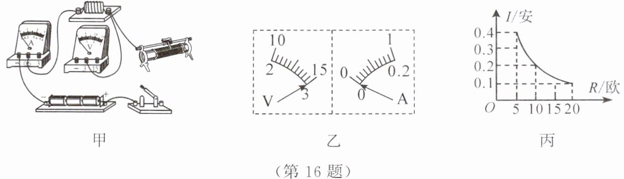 16. 小嘉在做“探究电流与电压、电阻的关系”的实验,可选择的器材有新干电池三节,$ 5 $ 欧、$ 10 $ 欧、$ 20 $ 欧、$ 30 $ 欧的定值电阻各一个,规格为“$ 30 \Omega \quad 0.5 A $”的滑动变阻器一个,电压表、电流表、开关各一个,导线若干。