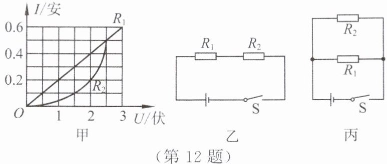 D.如图丙所示,当开关闭合、电源电压为2伏时,电路总电流为0.4安