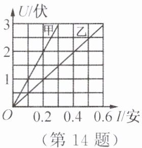 14. 现有如图所示的$I-U$关系图像,若将甲、乙两个电阻串联后接在0.2安的电路中,则电阻甲、乙两端允许加