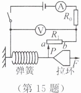 15. 某科学兴趣小组的同学利用所学的科学知识设计了一只电子拉力计(弹簧的电阻不计),原理如图所示。定值电阻$R_{0}= 5$欧,$R_{1}= 25$欧,电源电压为3伏,当不拉拉环时,金属片P刚好处于a端。