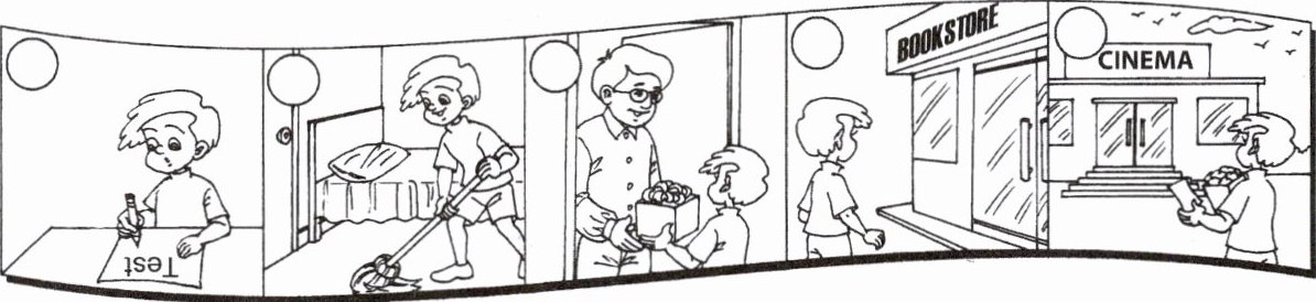 Jack: I'm going to clean my bedroom this morning. This afternoon I'm going to the bookstore by subway. This evening I'm going to visit my uncle. Then I'm going to the cinema to watch *Harry Potter*. That's funny.