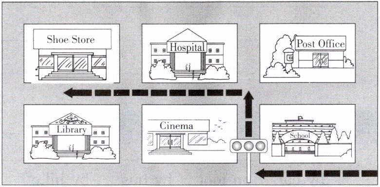 can I get to the bookstore?—Go straight and turn left. You'll see it next to the hospital.