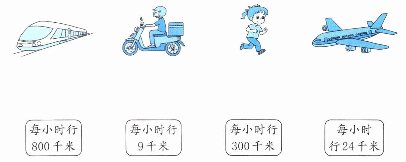 (连线答案按照上述对应顺序,如高速列车连每小时行800千米对应的框等)分别连直线即可。