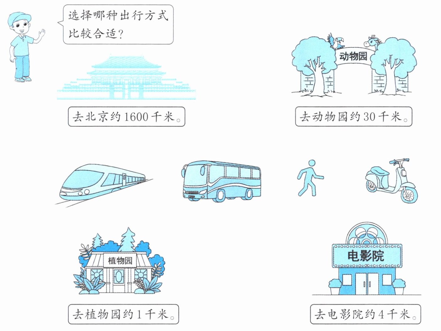 从左到右,从上到下依次连:高速列车——去北京约1600千米;公共汽车——去动物园约30千米;步行——去植物园约1千米;电动车——去电影院约4千米。