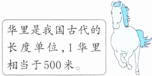 【解析】:因为1华里相当于500米,10华里则有10个500米,$10×500 = 5000$(米),而1千米等于1000米,5000米换算成千米为$5000÷1000 = 5$(千米);一匹千里马一天最多能跑1000华里,1000华里换算成米是$1000×500 = 500000$(米),500000米换算成千米为$500000÷1000 = 500$(千米)。