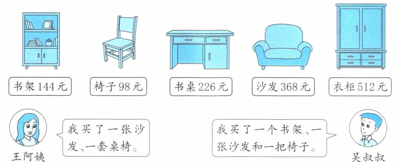 (2)算一算,王阿姨花了多少元?吴叔叔呢?