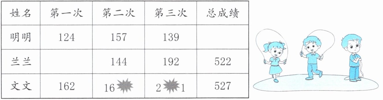 4. 下面是跳绳比赛的记录表,你能把表格中缺失的部分填完整吗?