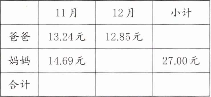 (1)爸爸小计:13.24+12.85=26.09(元)