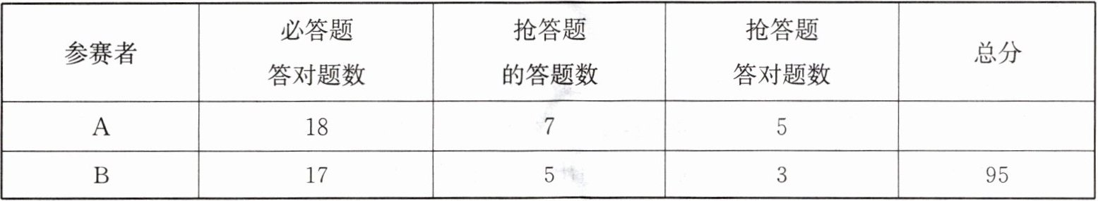 (1) 设抢答题抢到答对1道得x分,则抢到答错1道扣x分.根据B的得分可得17×5+3x-(5-3)x=95,解得x=10,所以A同学的总分为18×5+5×10-(7-5)×10=120(分).