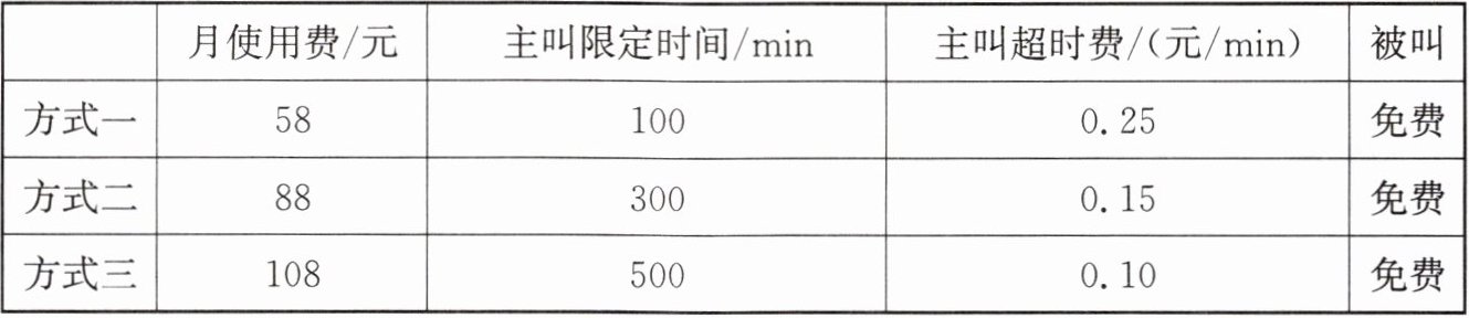 @@(2)由题意,得0.25t+33=108,解得t=300,如果选用方案二,需要付费88元.因为他12月份的主叫通话时长为300min,建议他选择方式二计费更合理.(3)如果是方式一,则0.25t+33=118,解得t=340;如果是方式二,则0.15(t-300)+88=118,解得t=500;如果是方式三,则0.10(t-500)+108=118,解得t=600.