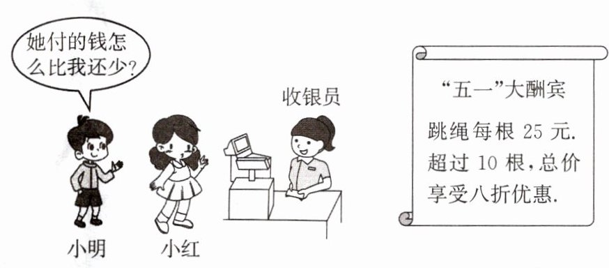 元;(2)小红比小明多买 $2$ 根,付款时小红反而比小明少 $5$ 元,你认为有这种可能吗?若有,请求出小红购买跳绳的根数;若没有,请说明理由.