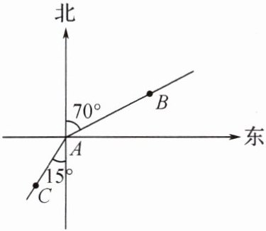 13. 如图,已知甲从点 A 出发向北偏东$70^{\circ}$方向走到点 B,乙从点 A 出发向南偏西$15^{\circ}$方向走到点 C,则$∠BAC$的度数是