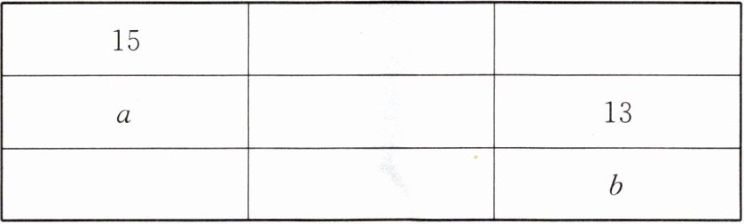 5. 将 1,3,5,7,9,11,13,15,17 九个数填入三阶幻方,使每行、每列、每条对角线上的三个数之和相等。如图,若小明已填入的 13 和 15 两个数是正确的解答,那么请你帮他把剩余的数填上并利用字母所代表的数,计算:$ b^a = $(