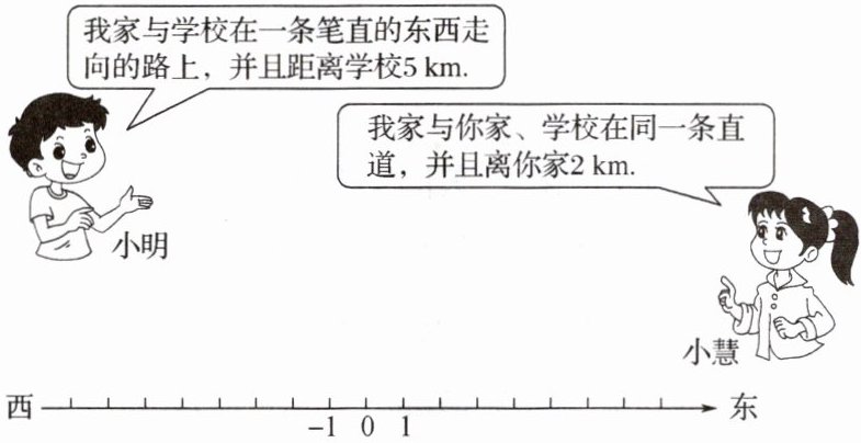7. 根据小明和小慧的对话,小慧家的位置唯一确定吗?请利用数轴(以学校为原点)求出小慧家位置所表示的数.