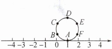 2. 如图,周长为$6个单位长度的圆上的六等分点分别为A$,$B$,$C$,$D$,$E$,$F$,点$A落在1$的位置.如果将圆在数轴上沿负方向连续滚动,那么落在数轴上$-2025$的点是点(