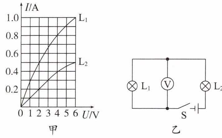 8. 灯泡$L_{1}$(标有“$6\ V\ \ 6\ W$”)和灯泡$L_{2}$(标有“$6\ V\ \ 3\ W$”)的电流和两端电压的关系曲线如图甲所示。现将其按图乙所示的电路连接,闭合开关,灯泡$L_{2}$恰好正常发光,则下列说法正确的是(