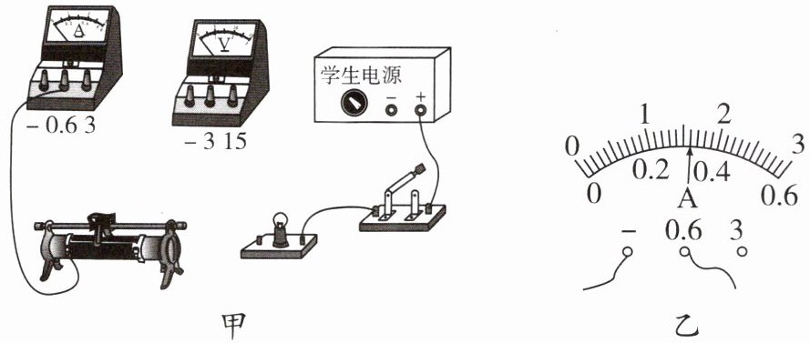 (3)正确连接电路后,闭合开关,发现小灯泡不发光,电压表和电流表都有较小的示数,则小灯泡不发光的原因可能是______。调节滑动变阻器,使电压表的示数为______$V$,小灯泡正常发光。若此时电流表的示数如图乙所示,其示数为______$A$,则小灯泡的额定功率是______$W$。