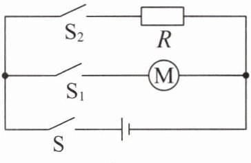 6. (2024·福建中考)小闽设计的车载可加热果蔬搅拌机的工作电路如图所示。电热丝的阻值$R为4\ \Omega$,电动机标有“$12\ V\ \ 24\ W$”字样。闭合开关$S$、$S_{1}$,电动机正常工作。