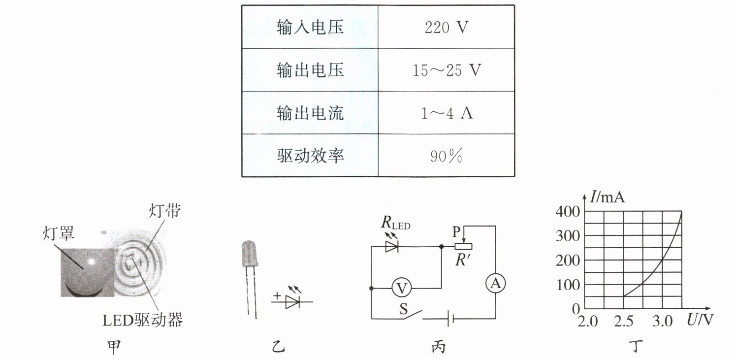 把图甲灯带中的一颗发光二极管接入图丙电路,调节滑动变阻器的滑片,记录多组电压、电流数据,描绘出如图丁所示的 I - U 图像。LED 驱动器的输入端直接接入家庭电路,输出端连接灯带。驱动器会根据发光二极管的接入个数和连接方式,智能调控“恒流”输出值或“恒压”输出值模式,以确保每个二极管都正常发光。图甲吸顶灯配置的 LED 驱动器参数如表所示,其中驱动效率指其输出功率和输入功率的比值。