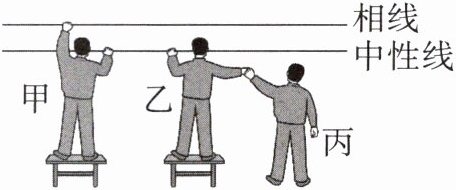 【典型例题】如图所示,甲、乙两人都站在干燥的木凳上,丙站在地上并与乙手拉手,上、下两根裸露的导线分别是照明电路的相线和中性线,那么一定会触电的是(