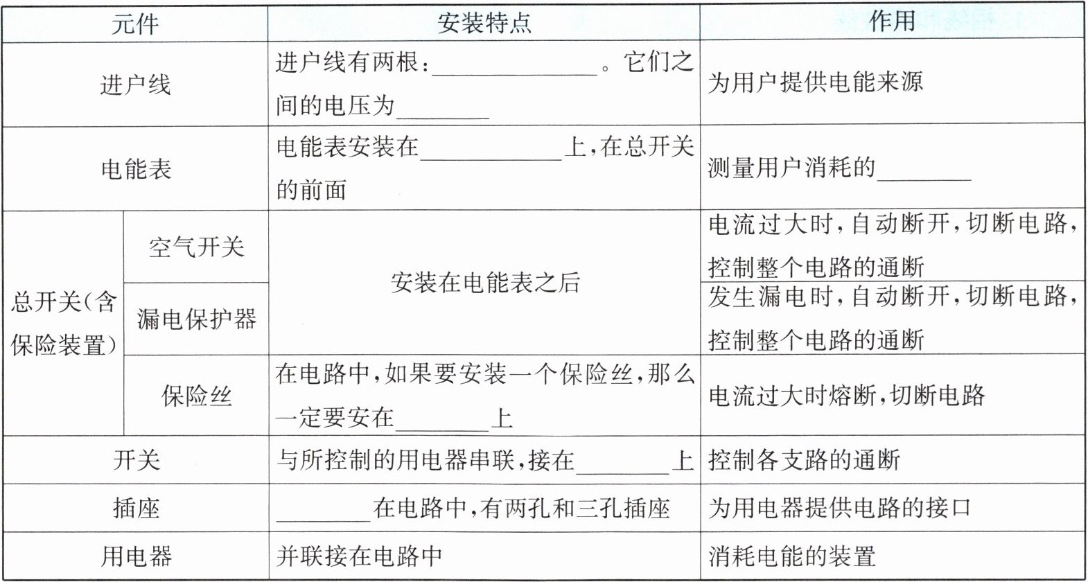 、用电器、导线等组成。2. 组成家庭电路的主要元件及其作用。