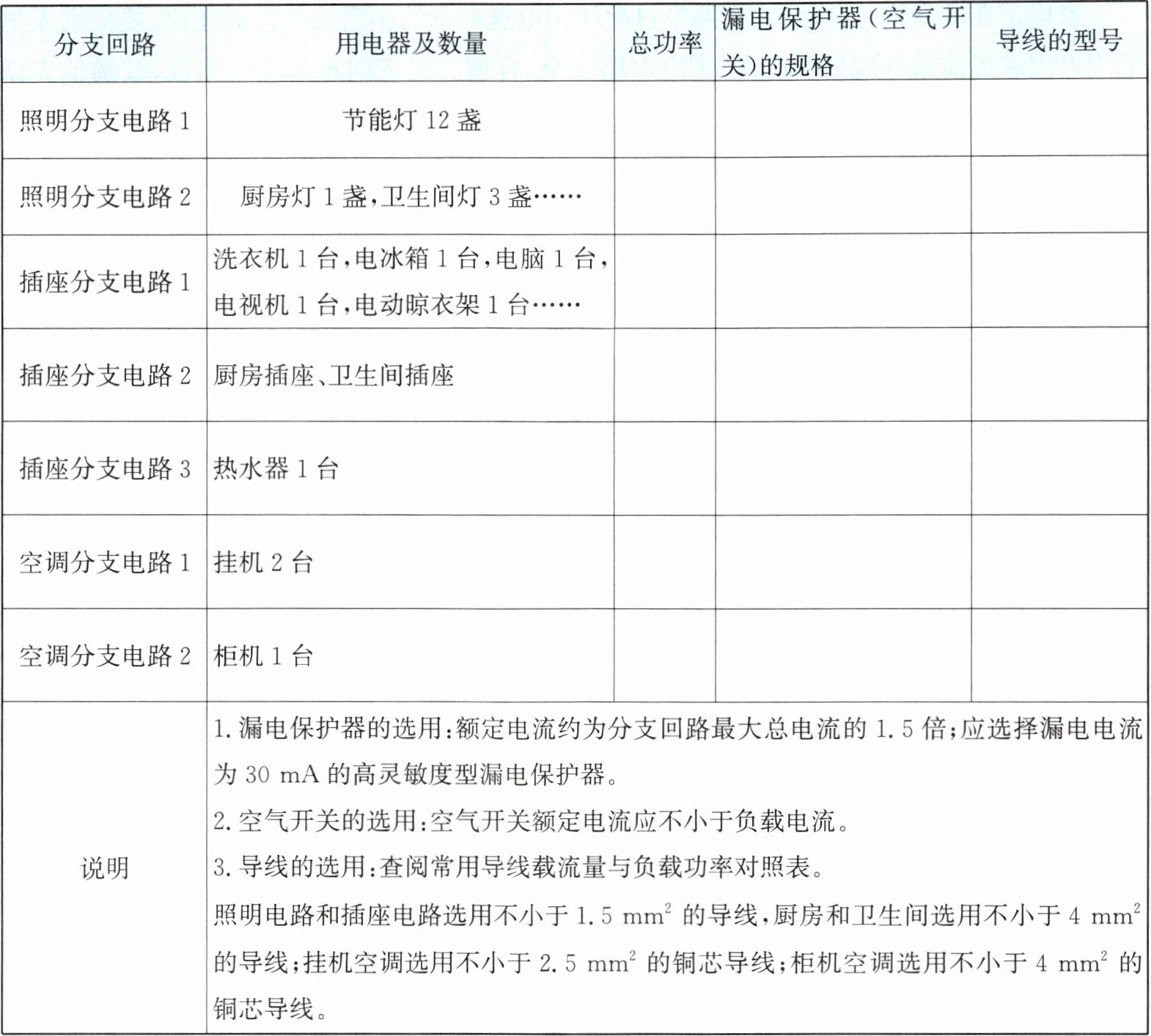 第 2 步,小明根据每个分支回路的用电器数量,对该分支回路所需要的漏电保护器(或空气开关)和导线规格进行了确定。分析表格如下。