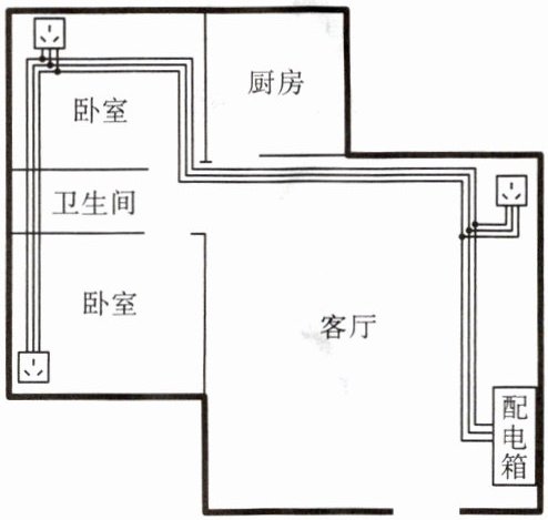 小明决定采用第二个方案,继续完成家里的分支回路设计。第 1 步,他画出了各个分支回路的设计示意图,如某插座分支回路设计示意图如下。