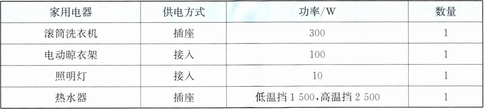 小明先设计了用电器调查细目表,并以房间为单位,对客厅、阳台、主卧、次卧 1、次卧 2、厨房、卫生间内的家电分别进行了统计。对阳台的统计如下。