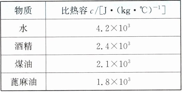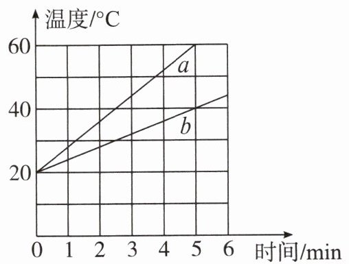 5. (2024·山东烟台中考)在探究物质的吸热情况与哪些因素有关的实验中,用质量是0.3 kg的水和表中等质量的另一种物质进行对比,作出的图像如图所示。实验过程中,水和另一种物质在相同时间内吸收的热量相等,分析图像可以得出图线______(选填“$ a $”或“$ b $”)对应的物质为水,另一种物质为______,这种物质在0~5 min内吸收的热量为______ $ J $。