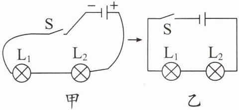 思路导引 用规定的符号替换实物图中的元器件,如图甲所示,然后再整理成规范的电路图,如图乙所示。