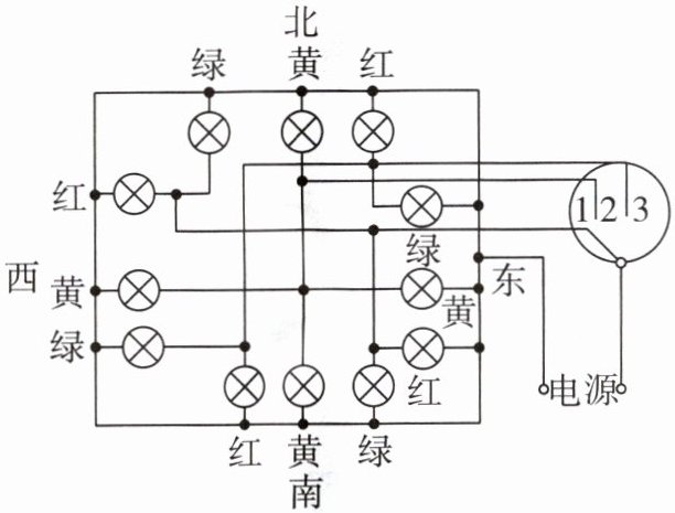 (3)但实际生活中,人站在东、南、西、北四个方向都能看见红绿灯信号,在老师的帮助下,他和同学们多次尝试,又设计出了如图所示的电路。当单刀多掷开关接通位置“1”时,(