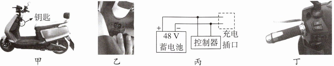(1)图乙是电动车的充电插口,内有金属插脚,在使用过程中绝不能用硬币、手等触碰;图丙是电动车的局部电路图,其中控制器是指电动车利用蓄电池工作的所有用电器。如果硬币碰到充电插口的两个金属插脚,就可能会造成______(选填“蓄电池”或“控制器”)损坏。