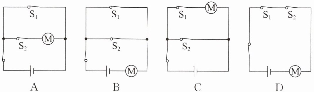 (3)电动自行车两刹车手柄(如图丁所示)中各有一个开关 $ S_1 $ 和 $ S_2 $。在行驶过程中用任意一侧的手柄刹车时,该手柄上的开关立即断开,电动机停止工作,以下电路符合要求的是______。
