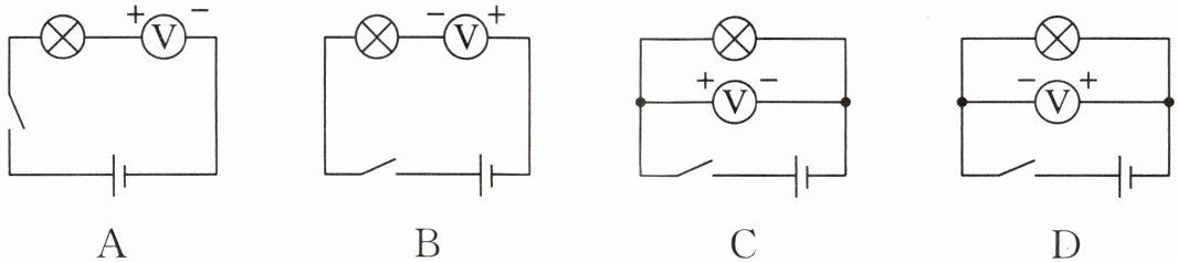 电压表应与被测用电器并联,A、B 错误。电流应从电压表正接线柱流入,从负接线柱流出,C 正确,D 错误。