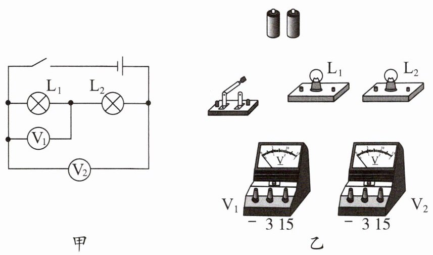 8. 按图甲所示的电路图,将图乙中的实物用笔画线表示导线连接起来,要求导线不交叉。(开关闭合后,图甲中$V_{1}的示数是1.8V$,$V_{2}的示数是3V$。)