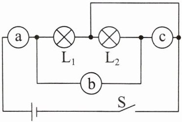 9. 如图所示,$L_{1}和L_{2}$两个灯泡并联,$a$、$b$、$c$三个电表(可能是电流表或电压表)的示数依次为$1.5$、$1.0$、$2.0$(单位为$V或A$),则灯泡$L_{1}$两端的电压为