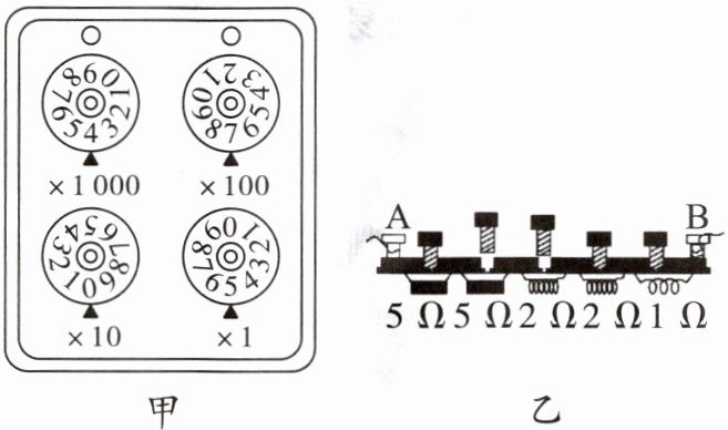 Ω。图乙所示的是插入式电阻箱,当铜塞插入间隙时,相应的电阻被短路,图中A、B两个接线柱之间的电阻值是7
