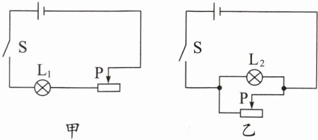 4. 如图所示,两个电路中电源电压保持不变,闭合开关S,当滑动变阻器的滑片P都向右滑动时,灯泡$L_1$和$L_2$的亮度变化是(