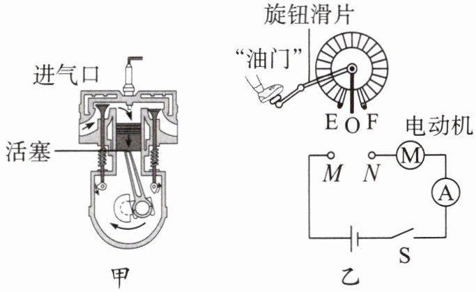 (2)图乙中的 E、O、F 为变阻器的三个接线柱,驾驶员踩下“油门”时,电路中变阻器的阻值减小,电流变大而加快电动机的转速,用笔画线代表导线将变阻器接入电路 M、N 处。