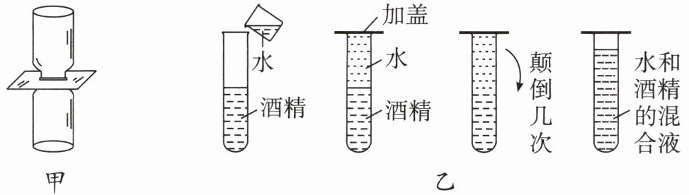 气体。如图乙所示,在一端开口的玻璃管内装有一半的酒精,再沿管壁慢慢地注入红色的水,这时可以清楚地看见红水和酒精的分界面,然后堵住管口,上下颠倒几次,使水和酒精充分混合,可以看见混合液体的体积小于
