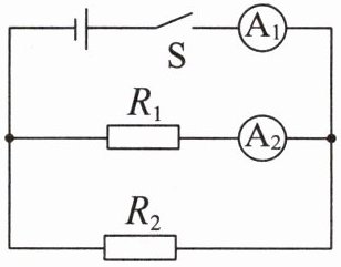 2. 将阻值 $ R_1 $ 为 10 Ω 的电阻器与另一阻值为 $ R_2 $ 的电阻器接入电源电压恒定的电路,如图所示。闭合开关 S,电流表 $ A_1 $ 的示数为 0.45 A,电流表 $ A_2 $ 的示数为 0.3 A,则通过阻值为 $ R_2 $ 的电阻器的电流为
