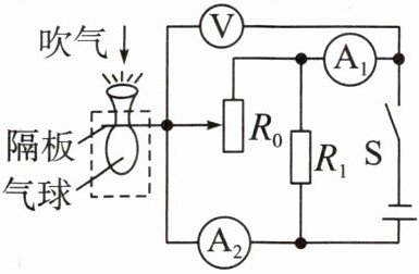 3.(2024·四川德阳中考)2024 年 3 月,德阳市青少年科技创新代表队在第 38 届四川省青少年科技创新大赛中取得优异成绩。下图是本次大赛德阳市青少年科技创新小组自制的肺活量比较装置,通过观察电流表示数的变化即可比较肺活量的大小。滑动变阻器的阻值为 $ R_0 $,定值电阻的阻值为 $ R_1 $,电压表、电流表为理想电表,电源电压保持不变。现闭合开关 S,科技创新小组成员向装置吹气,隔板向上平移,滑动变阻器接入电路的阻值变小,下列说法正确的是(