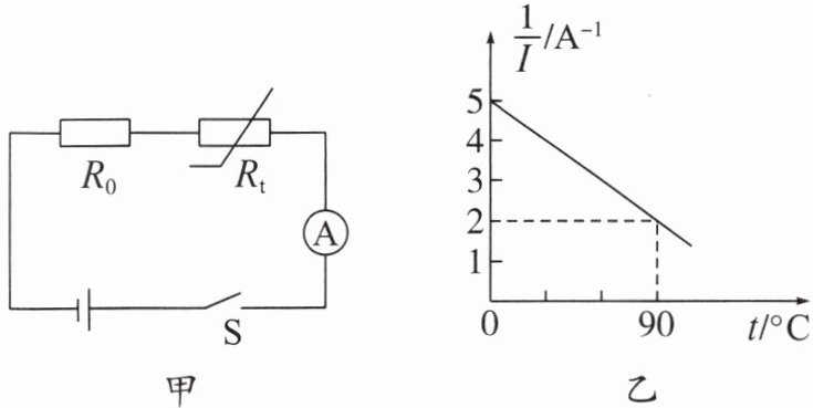 6. 图甲是一款温度测量仪的简易电路图,电源电压恒为 $ 12 \, V $,定值电阻的阻值 $ R_0 $ 为 $ 10 \, \Omega $,热敏电阻的阻值 $ R_t $ 随温度 $ t $ 的升高而减小,显示仪由测量范围为 $ 0 \sim 0.6 \, A $ 电流表改装而成,电流表示数的倒数 $ \frac{1}{I} $ 与热敏电阻温度 $ t $ 的关系图像如图乙所示。下列说法正确的是(